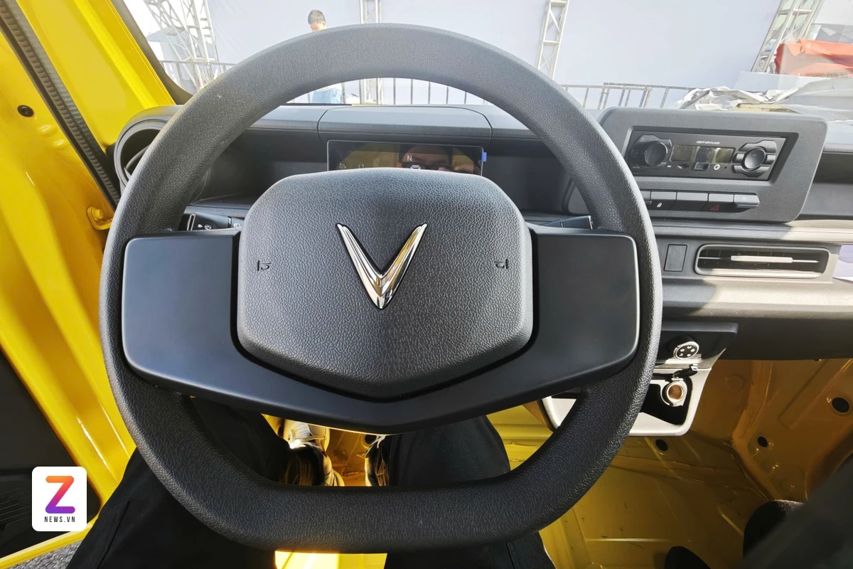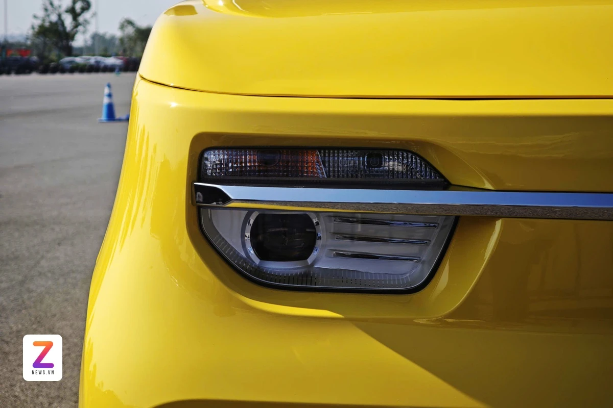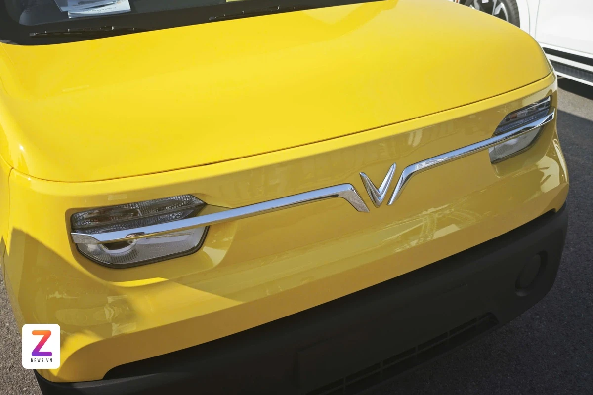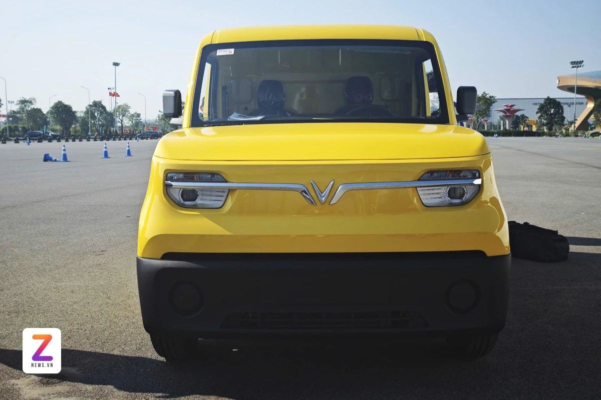 Cụm đèn pha halogen tạo hình góc cạnh, nối liền nhau thông qua dải crom sáng bóng. Cản trước màu đen trở thành điểm nhấn gia tăng tính thể thao và thực dụng cho mẫu xe tải điện của thương hiệu Việt.