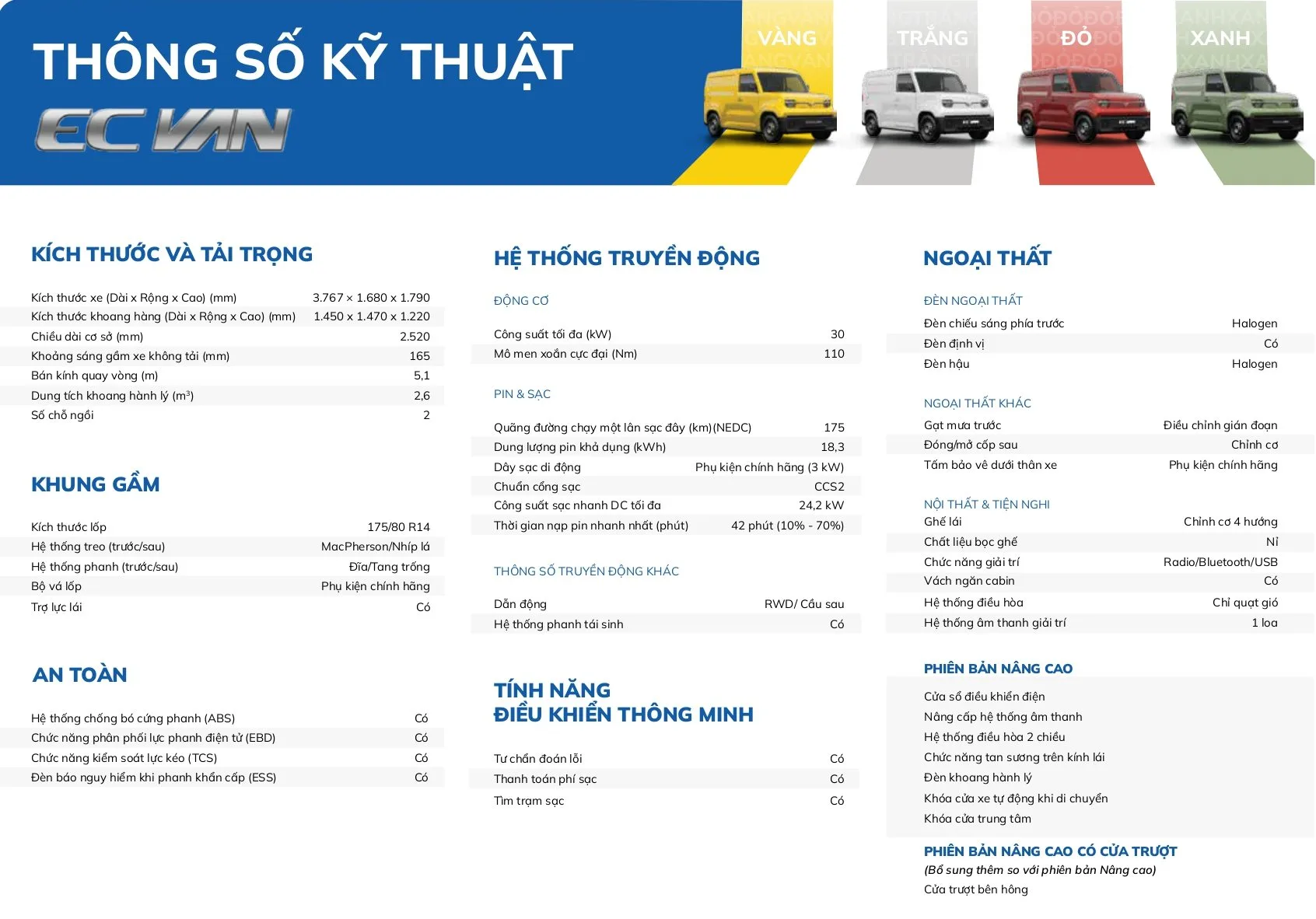 EC Van còn được hỗ trợ công nghệ sạc nhanh với công suất tối đa 19,4 kW, cho phép sạc từ 10% lên 70% pin trong 42 phút. Cùng với đó, nhà sản xuất còn cung cấp thêm tùy chọn bộ sạc di động 3kW phục vụ cho nhu cầu sạc tại nhà hoặc các điểm dừng chân.